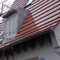 Dachdetails zu vorgenanntem Haus. Die neue Stahl- Holz-Konstruktion des Dachstuhls bildet auch die beidseitigen Gaupen aus. Die Lasten werden in den Gaupenbacken auf die Außenwände abgetragen.