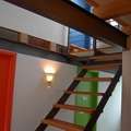Flurzone im Dach. Konstruktion und Grundriss bilden eine Einheit. Die Stahlträger von Gaupe zu Gaupe bleiben sichtbar. Die Felder zwischen den Balken- köpfen sind verglaste Oberlichter für die Kinderzimmer.