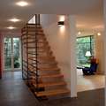 Im Erdgeschoss gibt es keine Raumtrennungen. Nur über die Materialauswahl für die Wände und Böden, der Ausbildung der Fensteröffnungen und einen Höhensprung im Fußboden, ergeben sich Gliederungen in Funktionsbereiche.