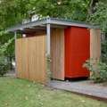 Eingangspavillion. Besucher warten hier überdacht auf Einlass. Und er schluckt den Müll und beherbergt die Fahrräder.
