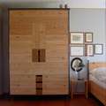 Rohstahl, Lärchenholz und Leder sind die Materialien diese Schrankes mit 2 Türen und 3 Schubladen. Das Doppelbett wurde in der gleichen Art gefertigt.
