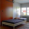 Diese Liege hat eine geteilte Matratze und lässt sich über einen hölzernen Scherenmechanismus zu einem Sofa umbauen. Die filigrane Konstruktion ist aus Eschenholz.Die Schiebetüre ist mit einer eigens angefertigten, sichtbaren Führung ausgebildet.