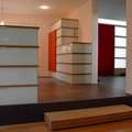 Das Sideboard im Vordergrund trennt die Küche vom Wohn- und Essbereich. Im Hintergrund ist der Haus- eingang zu sehen. Die Fassadengestaltung setzt sich in den Möbelfronten fort und die Farben werden wieder aufgenommen.