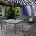 Dachterrasse. Pergola mit zusätzlichem Sonnen- schutz aus Markisenstoff. Mit diesen Stoffbahnen lassen sich interessante räumliche Abtrennungen herstellen.