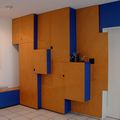 Beide Schränke sind mit Vogelaugenahorn und blauer Schichtstoffplatte belegt. Die schwarzen Quadrate bilden die Grifflöcher für die Türen des Geschirr- schrankes.